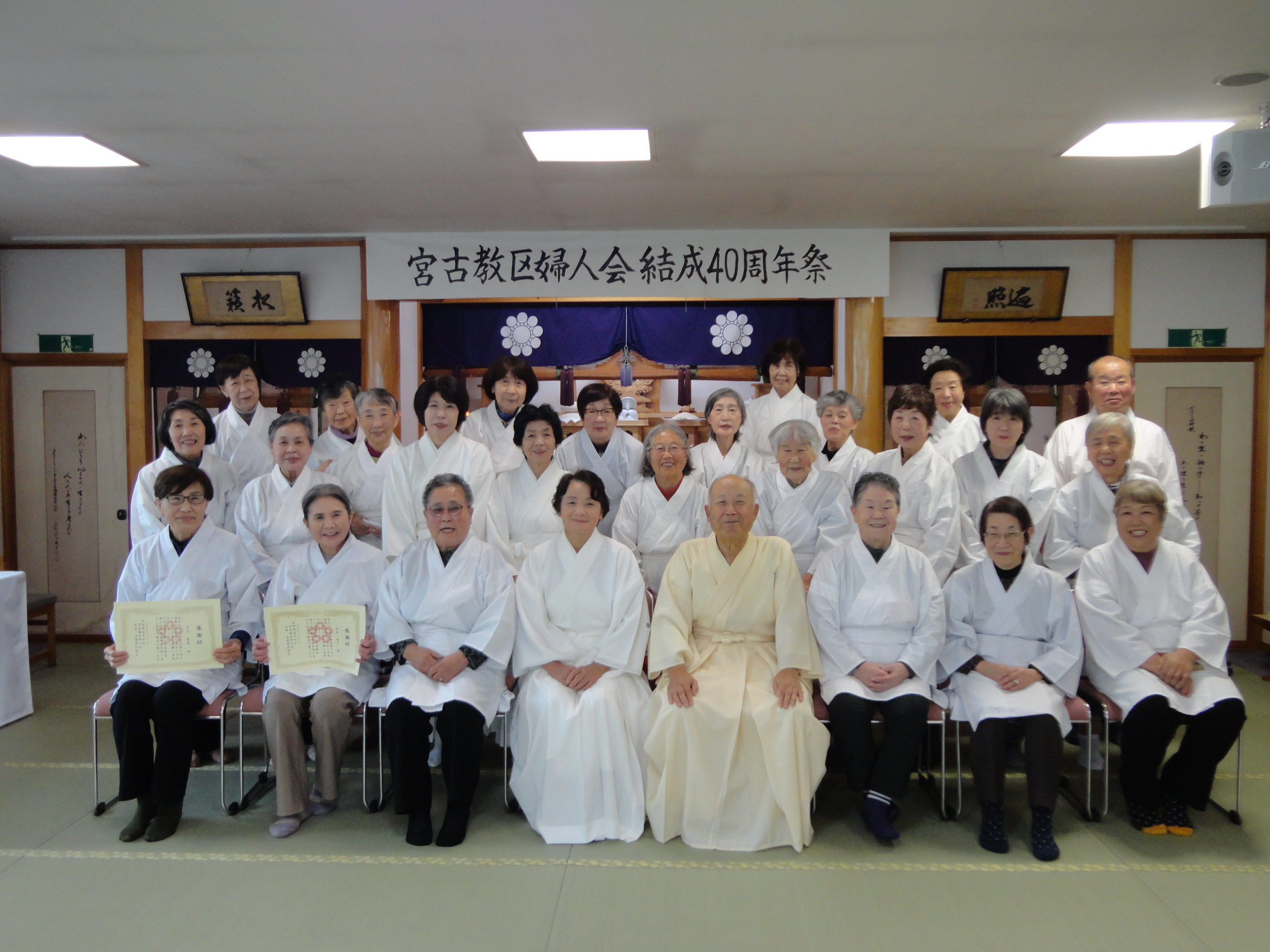次に、祭司の記念法話となり、神さまより松蝶さまを通して婦人会へ「桃花の路」「樹下の路」「女の集い」とお示しいただいたことについてお話しくださった。参加者は、家庭、支部、教区において常に明るく和合に努め、太陽のように光り輝く存在になることを誓った。また、連合婦人会からの祝電に一同感謝し、和やかに記念撮影を行った。