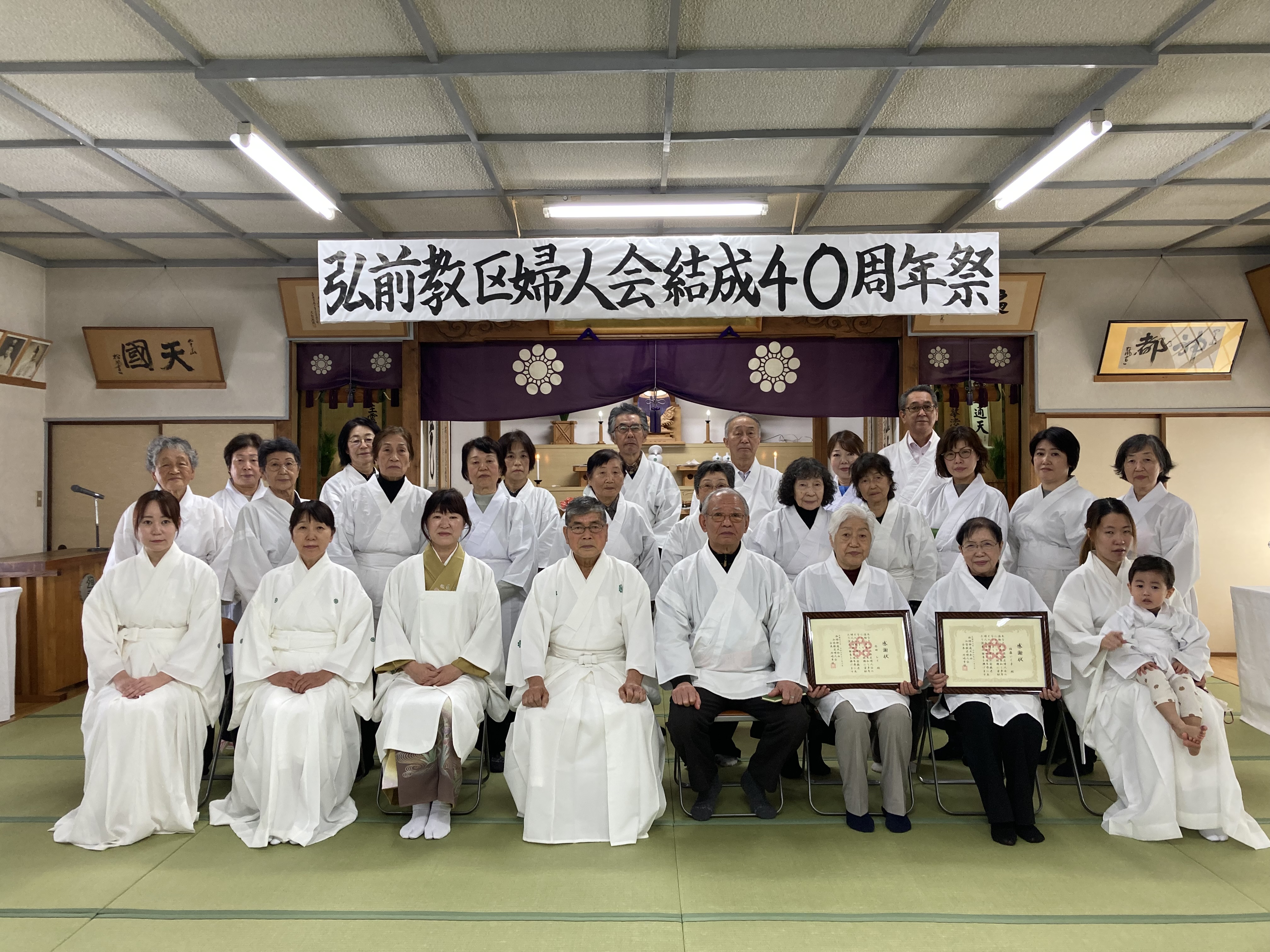 式典では、大和山聖歌「婦人部の歌」を奉唱後、外崎会長が挨拶に立ち、これまでの活動を紹介して歴代会長のご尽力を讚え、「私はすべての女性信者が婦人会員だと思っています。どうか皆さん、これからも婦人会活動にご協力をお願いいたします」と呼びかけた。続いて、婦人会発展のためにご尽力くださった歴代会長の内田レイ(弘前)、佐藤いく子(弘前)の両氏に外崎会長から感謝状と記念品が贈呈された。