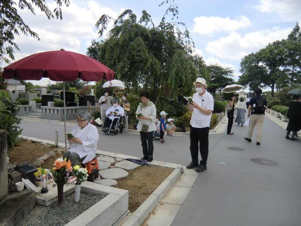 いつものように地蔵尊の周りを清掃し、会員から寄せられた折鶴、お花、供物が整えられ、午前11時より佐藤智子会長の先導で礼拝が始まった。暑い中でも、時折爽やかな風が吹いて神さまのお見守りを感じながら、「満州の地で亡くなった方々の御霊をお慰めできますように」と祈念して、全員がお線香を手向けた。